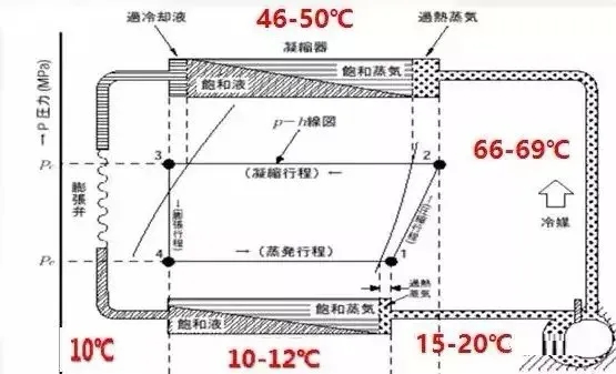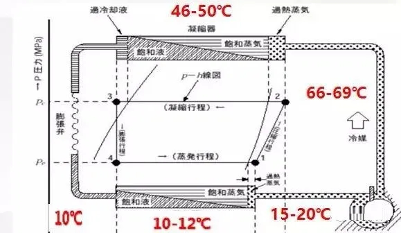 按照經驗,系統的冷凝溫度=環境溫度+(10~15℃);我們以夏天環境溫度35℃空調為例子。